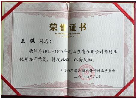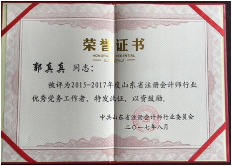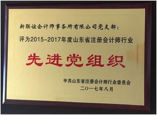 2017年8月,新聯(lián)誼會計師事務(wù)所支部被評為2015-2017年度山東省注冊會計師行業(yè)先進(jìn)黨組織;劉洪和、王銳同志榮獲2015-2017年度山東省注冊會計師行業(yè)優(yōu)秀共產(chǎn)黨員,郭真真同志榮獲優(yōu)秀黨務(wù)工作者。